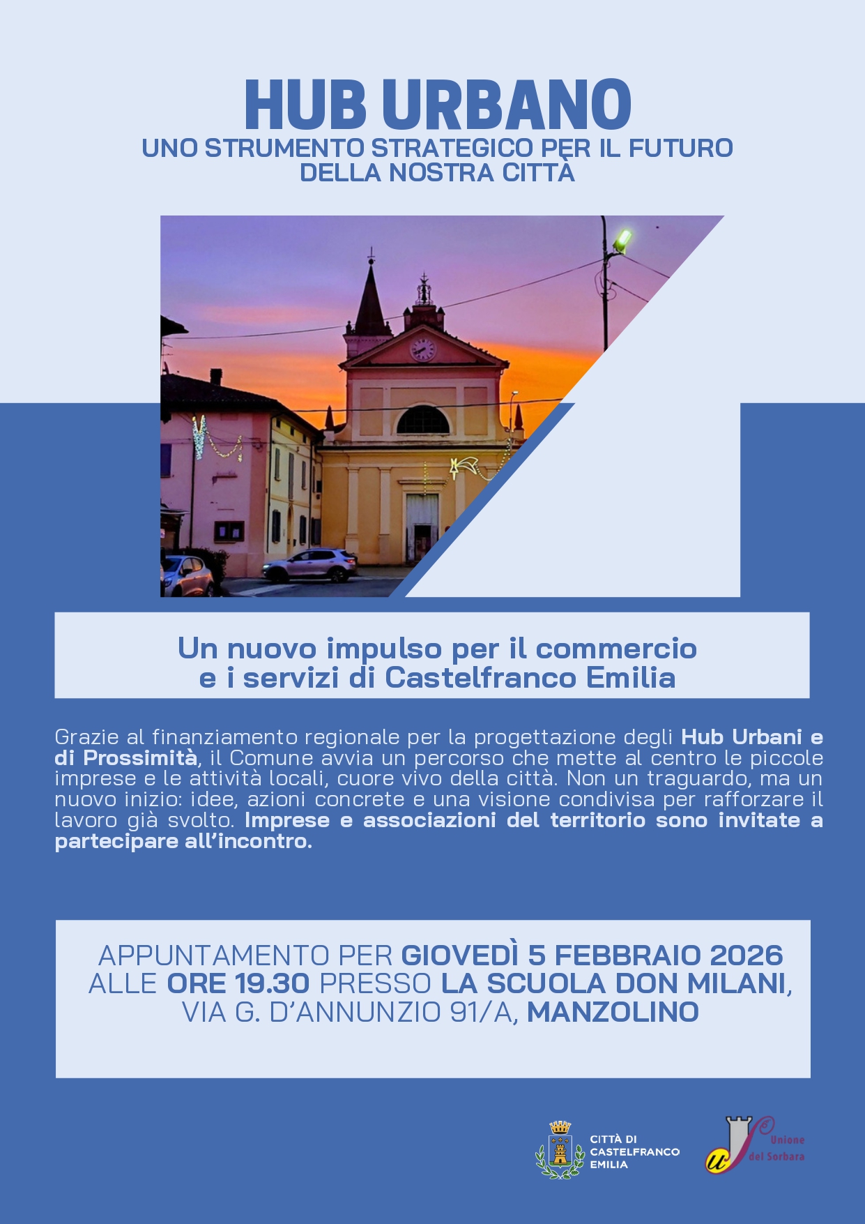 L’amministrazione comunale di Castelfranco Emilia desidera invitare le attività economiche e le associazioni del territorio all' incontro dedicato al progetto “Hub di prossimità” della frazione di Manzolino.